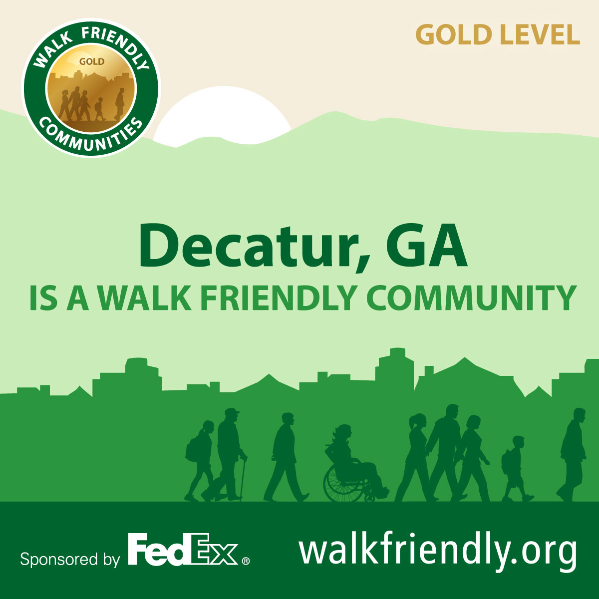 The City of Decatur has been recognized by the Walk Friendly Communities Program as a Gold Level Walk Friendly Community (WFC) for its commitment to prioritize pedestrians and create safe, comfortable and inviting places to walk. Decatur has previously been recognized as Silver Walk Friendly Communities, and the new designation demonstrates a sustained commitment to prioritizing people on foot. Decatur is the smallest city of its size to achieve Gold recognition!