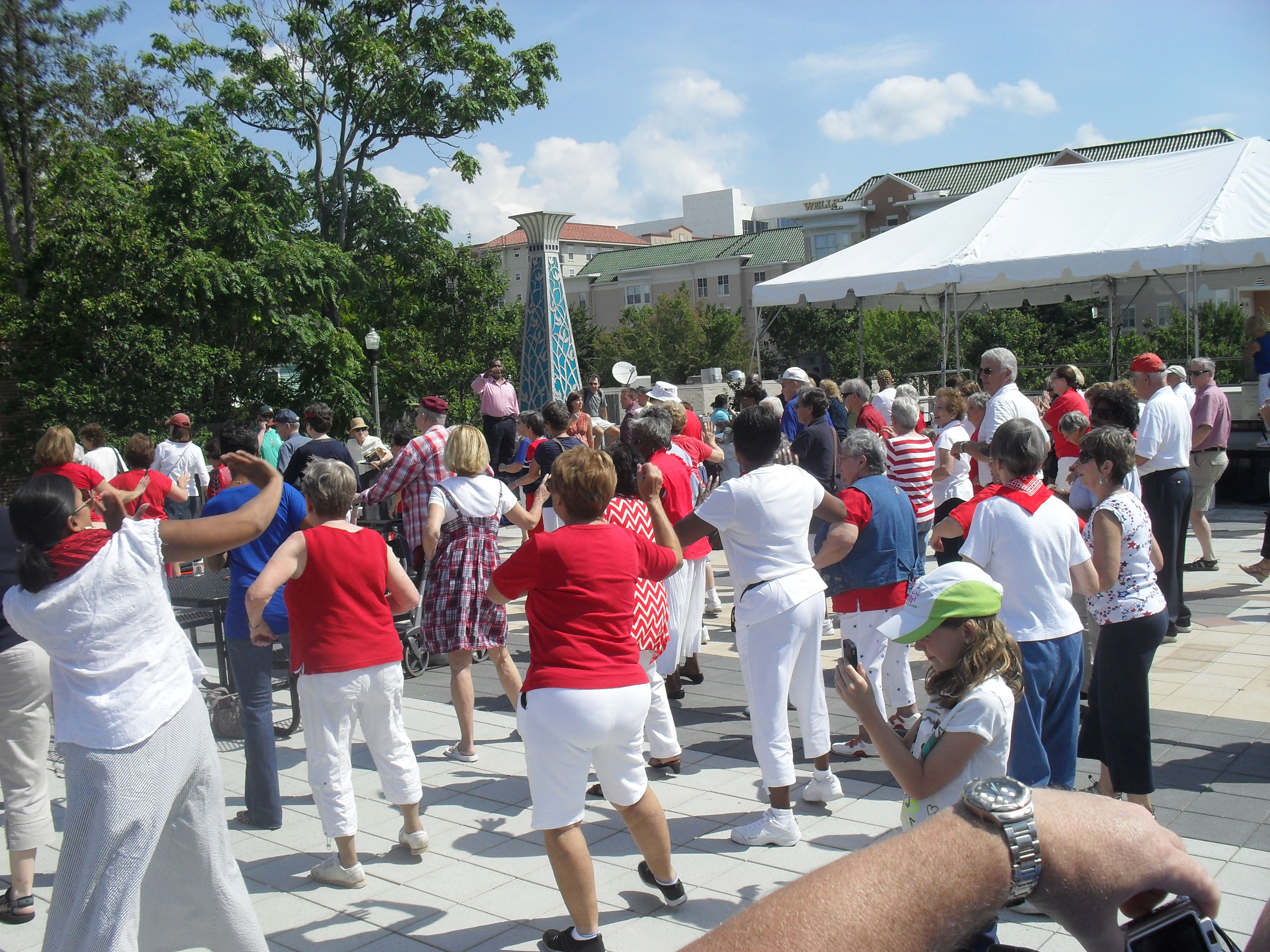 Yes, you read that correctly! Yesterday’s Blue Sky Concert began with a great surprise – hundreds of active adults (and some children) participated in a Flash Mob! The event was the brainchild of Lisa Kiely from Park Springs, a Senior Living Facility. Her residents participated along with seniors from Bobbie Elzey’s exercise classes and seniors and children from the Decatur-DeKalb YMCA. It was so much fun!
